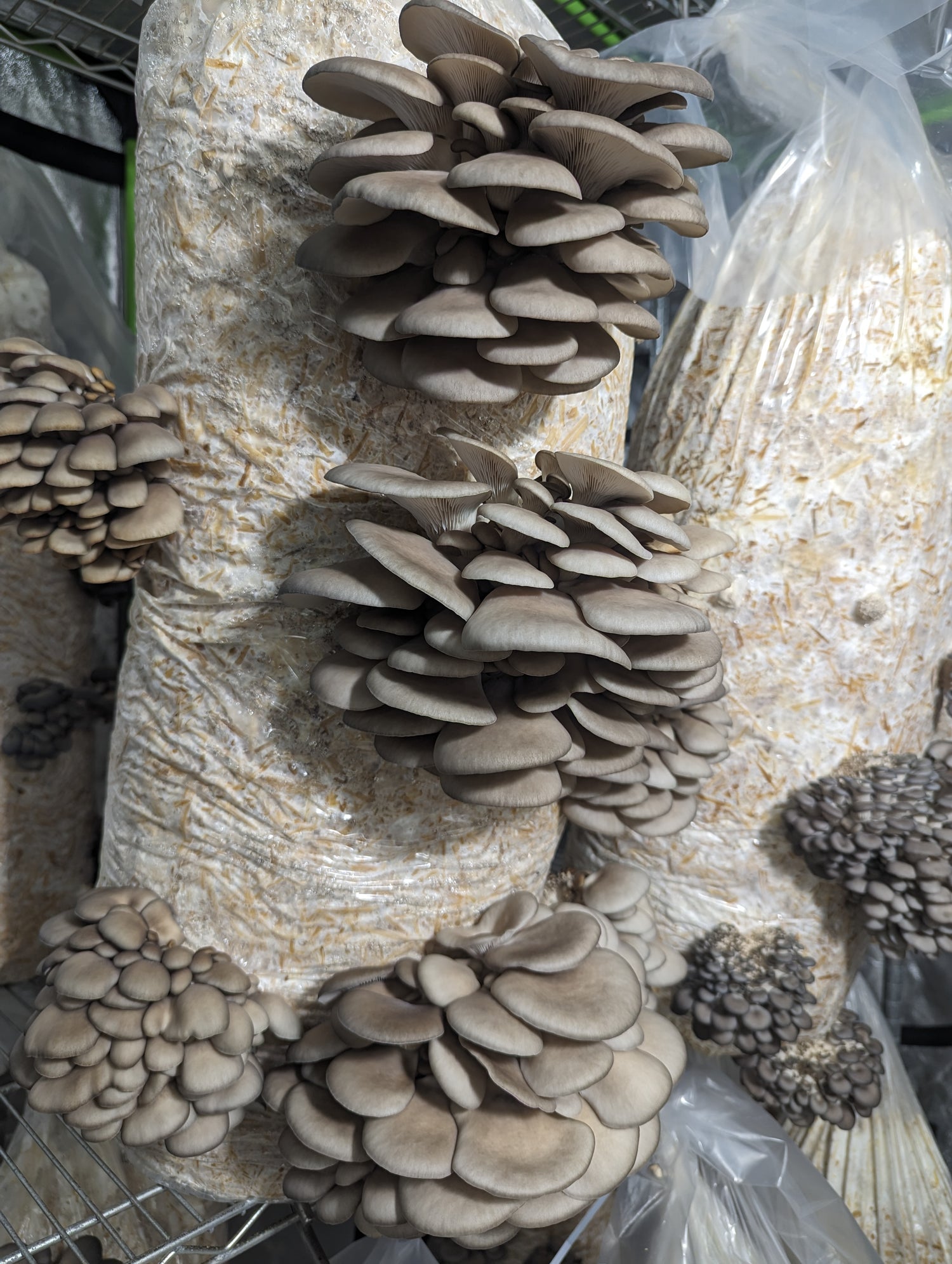 This process uses less energy and plastic than conventional mushroom cultivation techniques and creates a better soil amendment than sawdust substrates. We're developing new varieties of mushrooms adapted for this technique that have richer flavor and more umami.